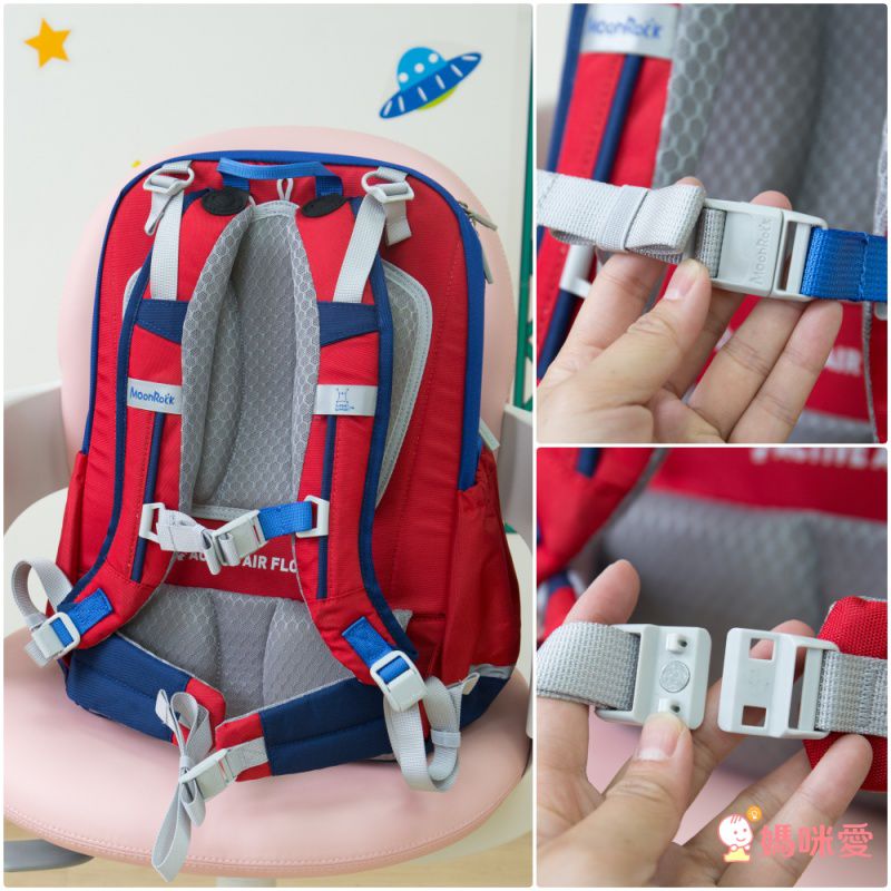 另外一個讓人印象深刻的設計,就是這個環扣式多角度肩帶了!一般書包的肩帶都是直接縫在背面的,但MoonRock書包的肩帶可以依據孩子的肩膀寬度自動調整,因此背起來就像是為了每個孩子量身設計的,更服貼、更合身。而MR3 S更在這塊做了加強設計,讓肩帶可往外拉的彈性更大卻不造成離心力拉扯,更能盡情活動!