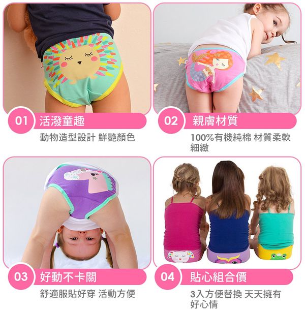 穿上可愛的內褲,心情也會跟著好起來唷~100%有機純棉親膚又好動,可愛的造型一組三入方便替換,寶寶有時還會指定想穿心愛造型的內褲呢!