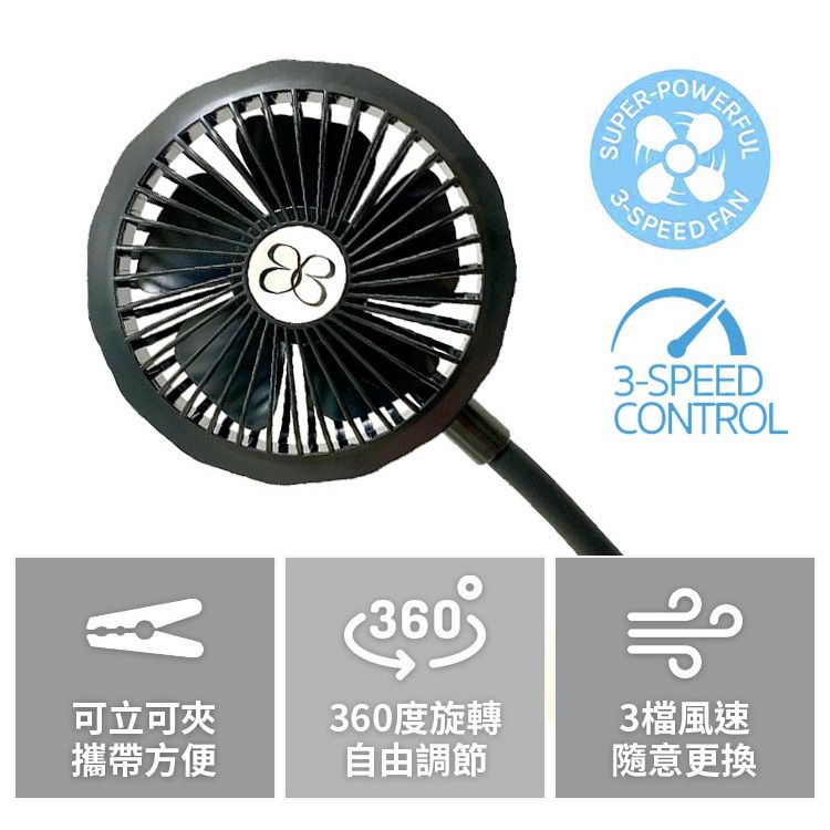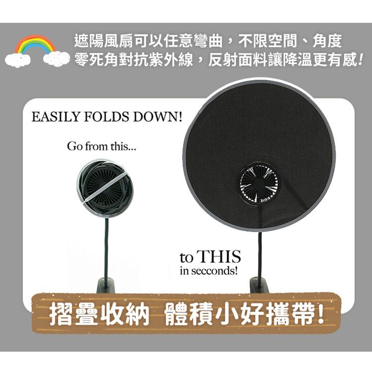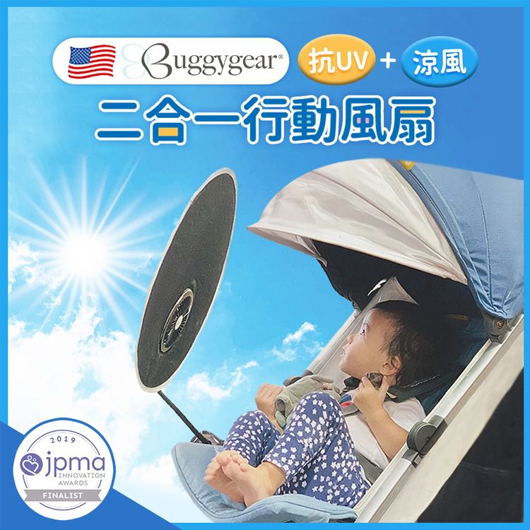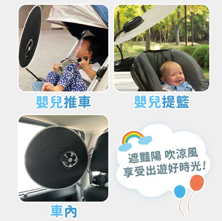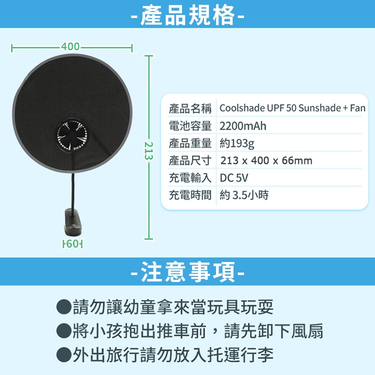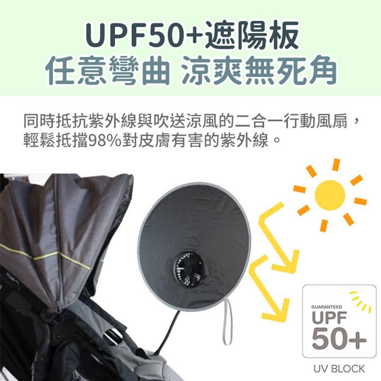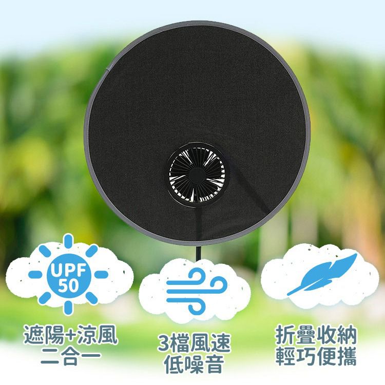 UPF50+遮陽板根涼風扇結合,還有3檔風速可調整,低噪音又方便攜帶