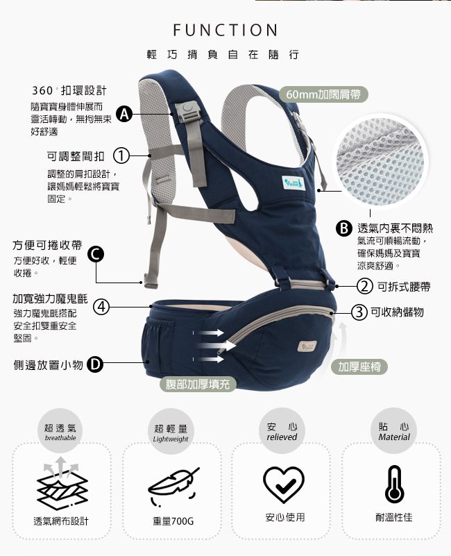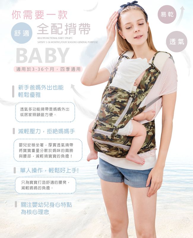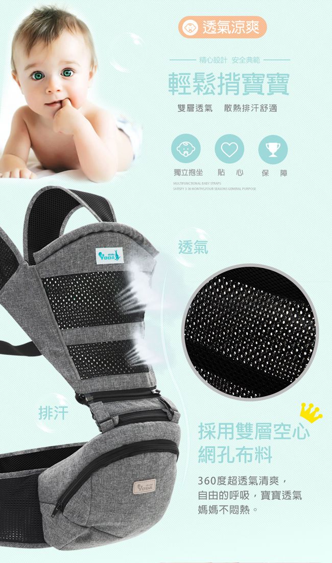 除了減壓之外,『透氣功能』對揹著寶貝趴趴走的爸比媽咪來說,絕對必須考慮!尤其夏天來臨,總不能整天揮汗如雨,爸媽不舒服,寶貝也不舒服@@嚴重一點狂流汗還會汗疹長滿身,媽媽我超級心疼啊QQ