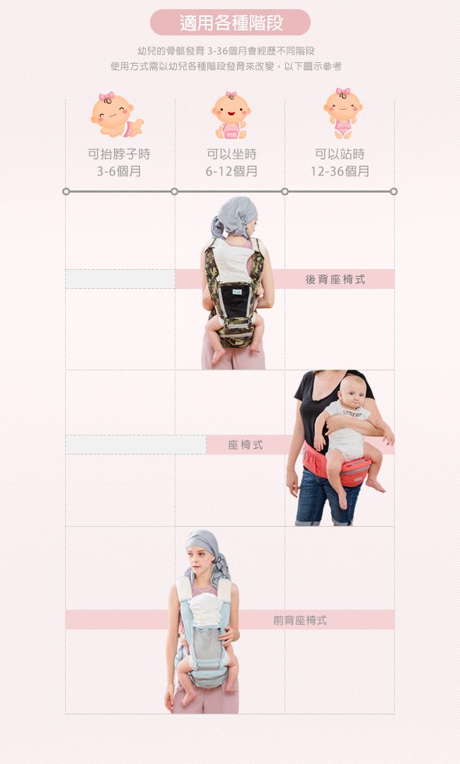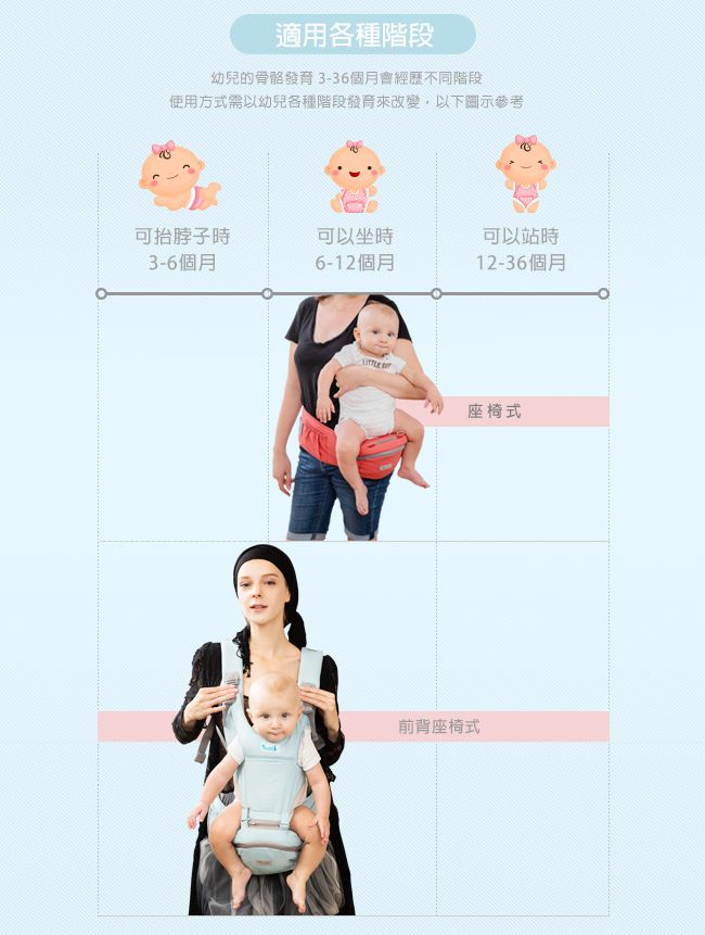 適用3~12個月的寶寶,以布面包覆住寶寶,並讓寶寶呈現C型背及M型腿,不阻礙寶寶成長發育!