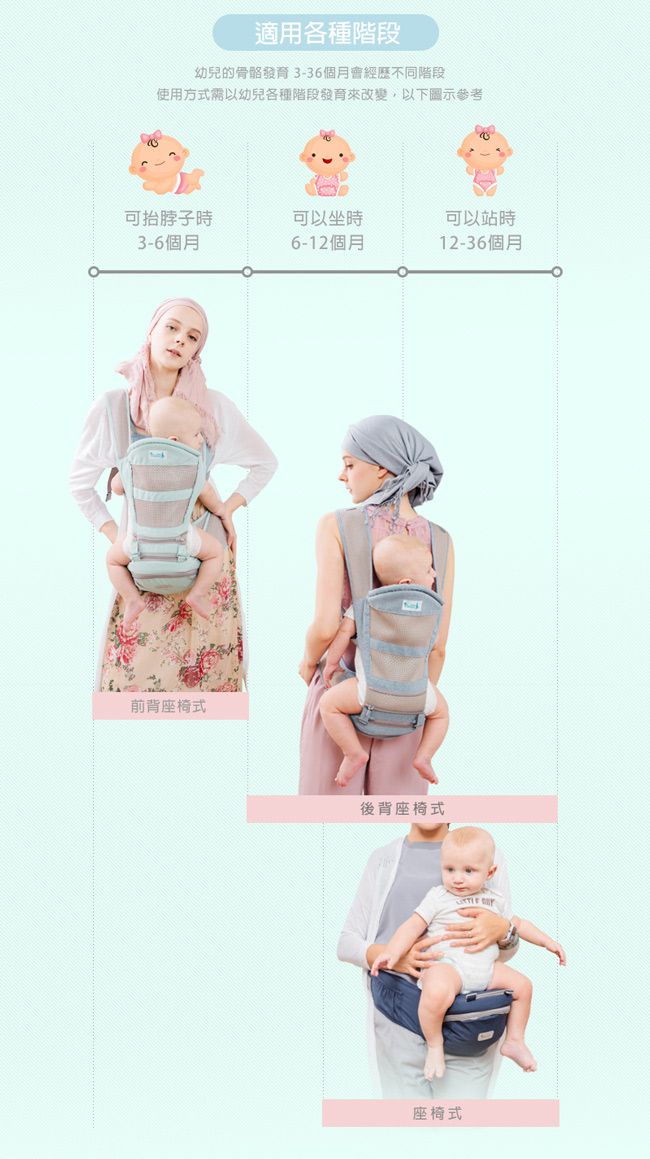 適用5~36個月的寶寶,寶寶可以乘坐在椅墊上,當孩子長大一點,可以選擇此背法,舒適度提升外,椅墊亦能分散寶寶的重量唷!