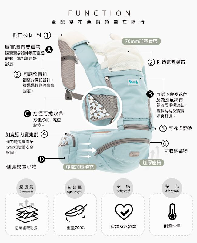 整個背帶除了可機洗、材質輕巧外,通過SGS檢測,針對寶寶會接觸到的布面做測試,不含螢光物質、偶氮色料、有機錫,符合CNS15503兒童用品安全規範,呵護孩子不傷皮膚。