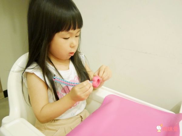 前面先由我示範編一部分,再讓蕾蕾看著做,編織手鍊需要很多精細的手部動作,對快 4 歲的蕾蕾來說還有點挑戰度,所以我也會在旁邊教他該穿哪個洞,或是把其中一條線分配給他,減少她需要記憶的部分,成功率也會比較高喔。
