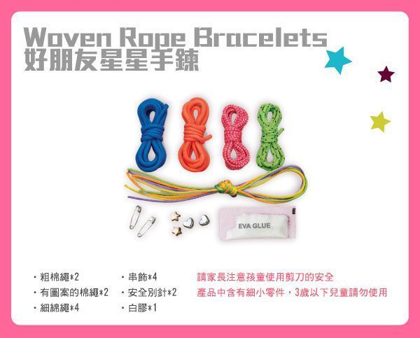 內容物:彩色線繩 x5、扣環 x6、電子錶 x1、花朵框 x1、白膠 x1、說明書 x1