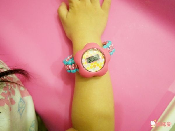 做好的編織手錶挺可愛的!很適合小女生佩戴喔~大大的花朵錶面很顯眼,時間的部分是電子鐘,大一點的小朋友也能自己看唷!蕾蕾一直說很喜歡,還說一定要拿去學校給同學看~(噗!這不是炫耀嗎~看可以~千萬別拿去交換啊XD )