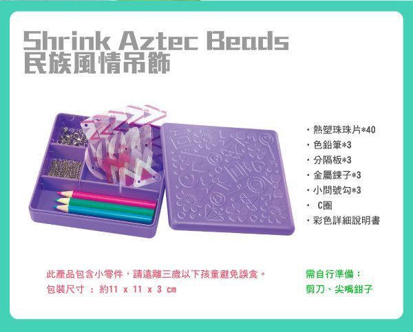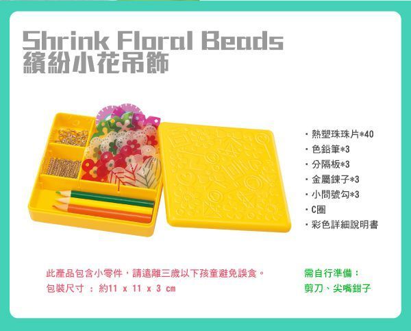 熱縮片首飾製作我覺得 4、5 歲孩子,只要喜歡畫畫就可以參與了!共有四盒不同造型,每一盒都能製作出 3 條華麗的項鍊╱手鍊唷~