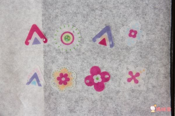 經過烤箱 30 秒加熱後~輕飄飄的熱縮片就會變硬、變透亮(顏色也更飽和了)接著就像串珠珠一樣一顆顆固定起來,不需要鉗子就可以互相串起來囉!