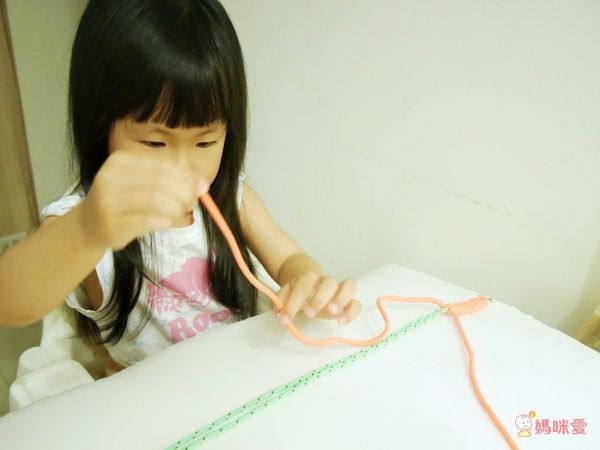 編織手法跟我們小時候玩的幸運繩類似,上小學的小童自己挑戰是沒問題的!編織這種精密動作對快四歲的蕾蕾來說,還是有點吃力,不過為了提高她的自信心及參與感,我還是指派她去完成穿線、穿洞或是畫圖的任務。