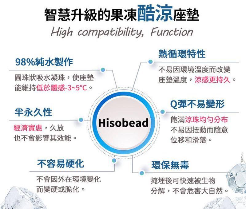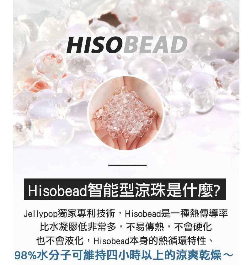 Jellypop獨家專利技術,是一種熱傳導率比水凝膠低非常多,不易傳熱、不會硬化、也不會液化的材質,而且利用 Hisobead 本身的熱循環特性,98%水分子可維持四小時以上的涼爽乾燥