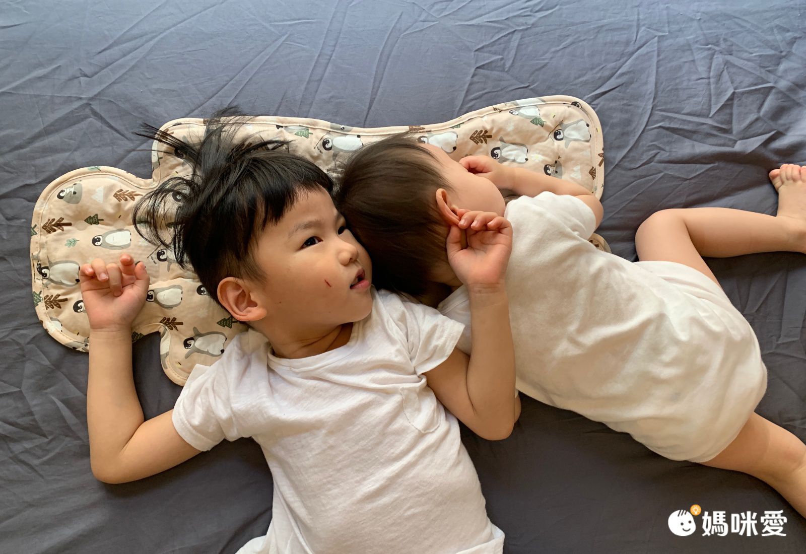 自從哥哥知道妹妹有新的涼墊,也搶著想體驗看看躺在上面有涼涼的嗎?午睡時放在床上當涼枕使用,兄妹也各搶一角躺著