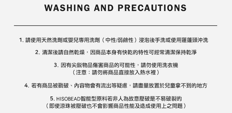 洗滌方式:請使用天然清潔劑或嬰兒清潔劑清洗,自然陰乾/不可機洗/不可脫水/不可烘乾/避免直射太陽