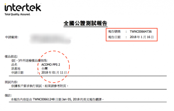 檢驗報告:Intertek TWNC00606676