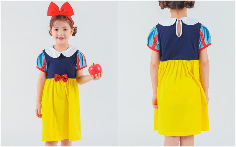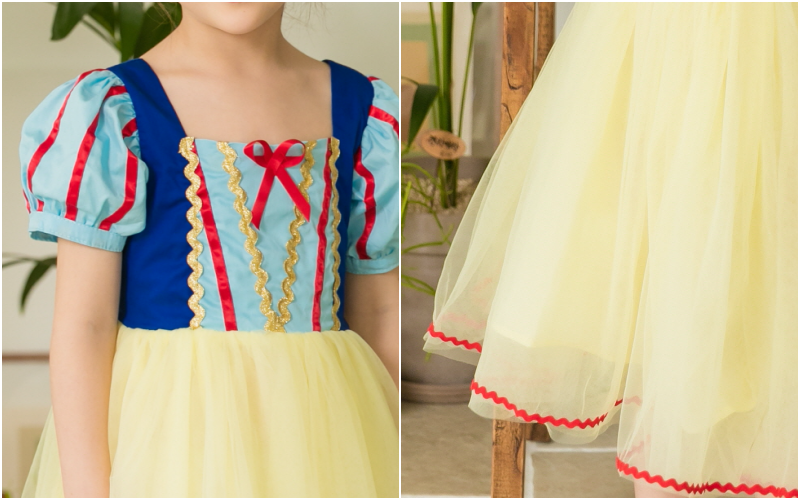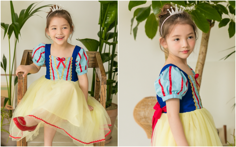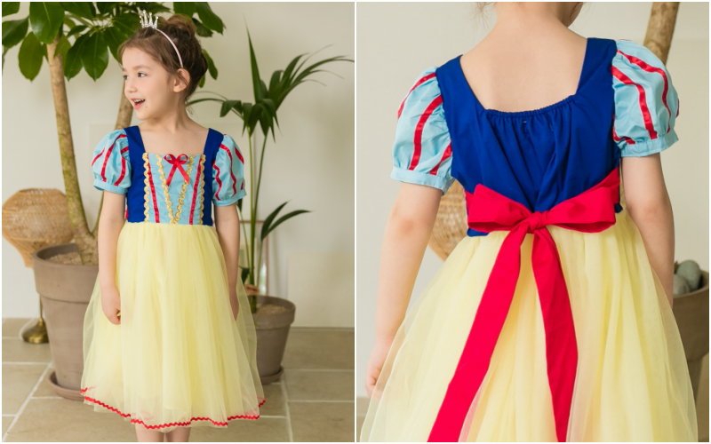 經典的白雪公主配色和絲綢般高貴的布料材質與淡鵝黃色細柔網紗,整體看起來柔和又優雅!