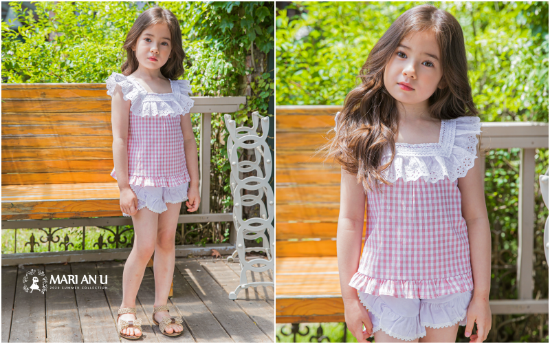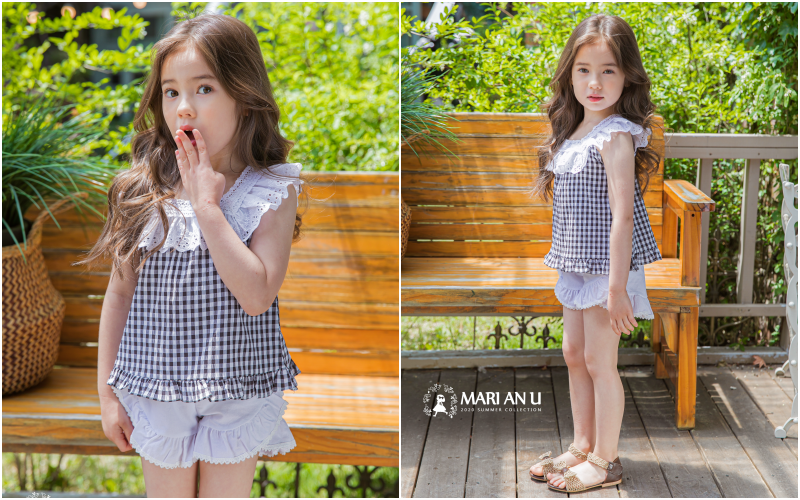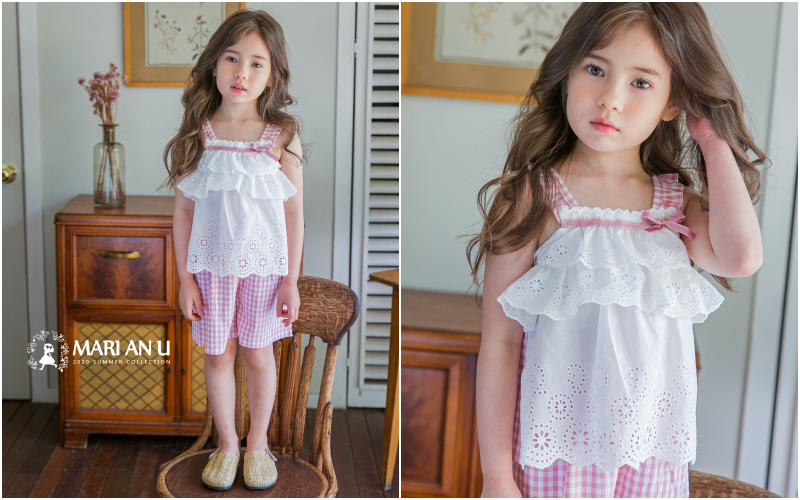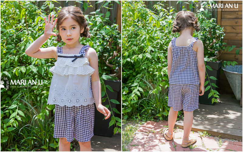夏天經典元素格子和藍白/粉白配色,看上去就非常討喜可愛!胸前的蕾絲與蝴蝶結也繼承了Mari An U的靈魂~