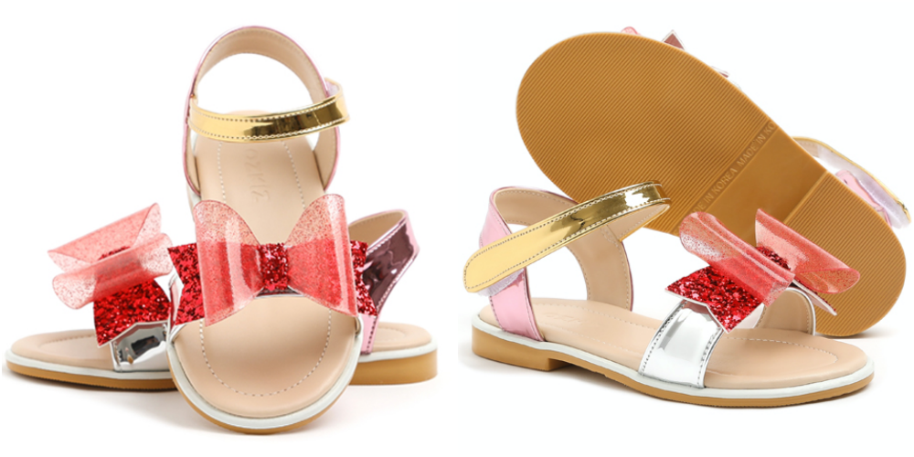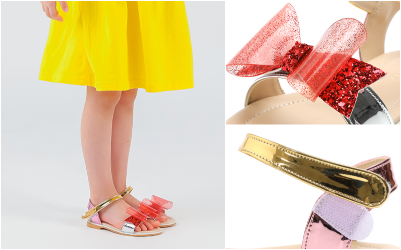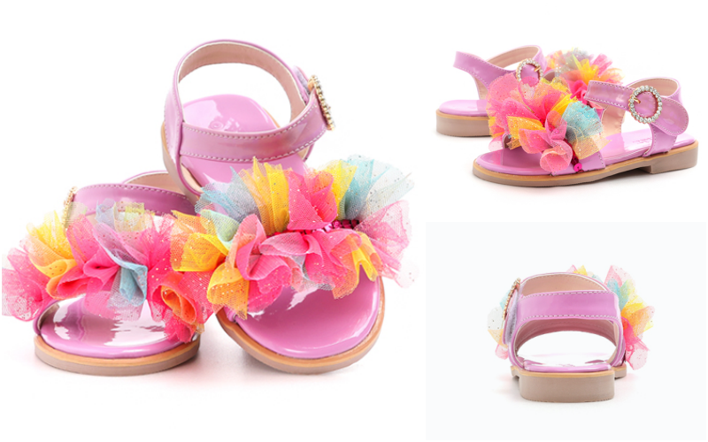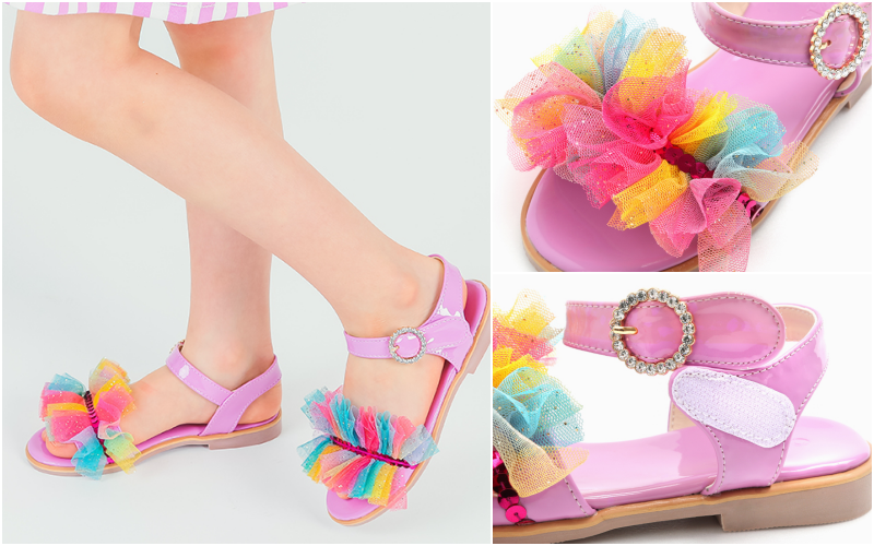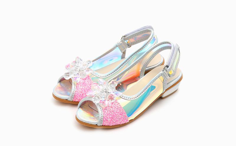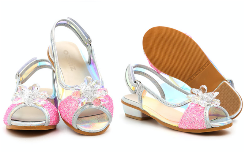 旁邊雷射布料隨著光線與視角的轉動不停變換美麗的顏色,小朋友真的超級愛!還有鞋頭的水晶花朵,更是華麗到不行!