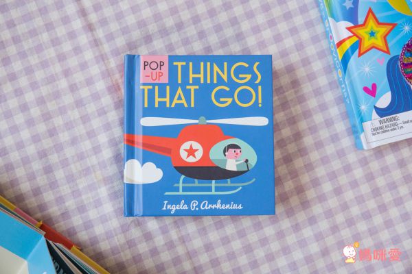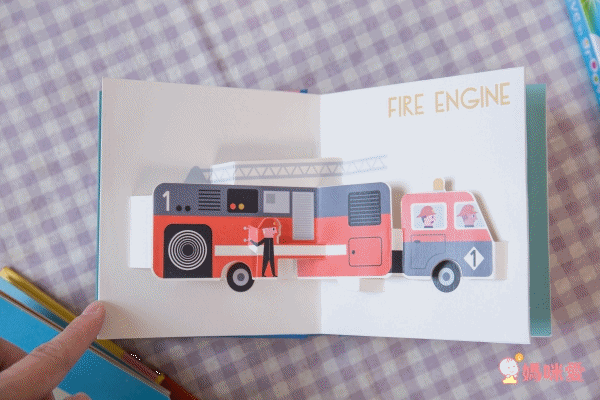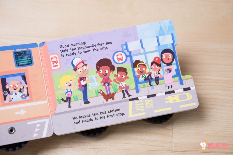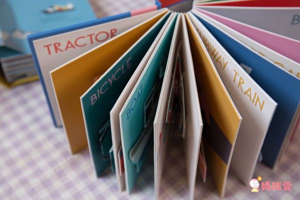 迷你口袋造型書,大小只有 12.7x12.7cm,小小一本放在媽媽包裡,孩子隨時都能拿出來翻閱唷!裡面包含 15 種不同款式的交通工具,像是拖拉機、冰淇淋車、腳踏車、飛機、船、消防車....等等,畫風非常可愛,翻開來還是立體的唷!