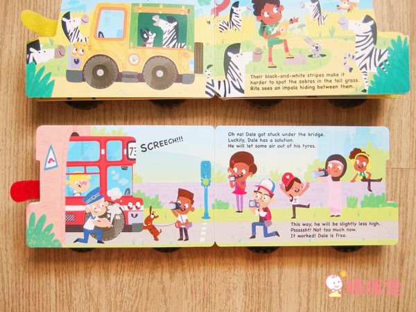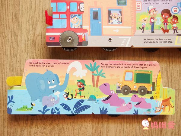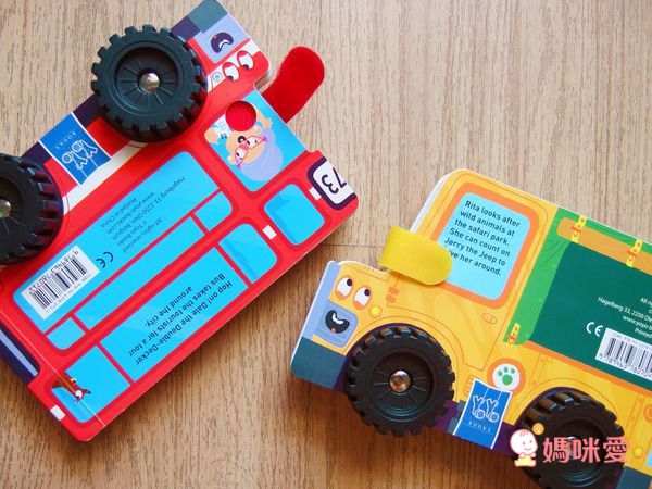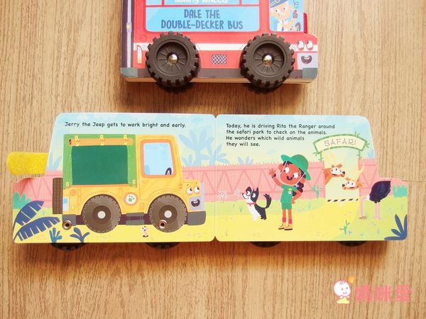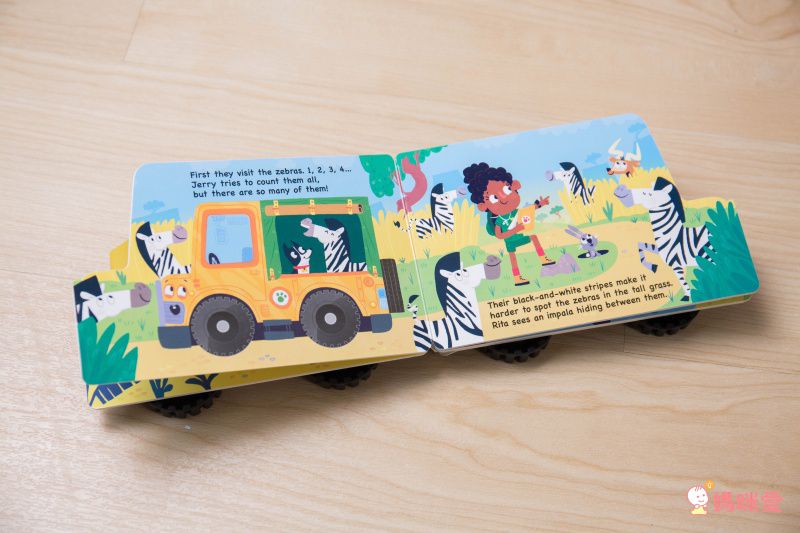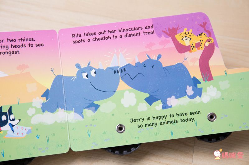 車輪書有趣的是,用故事帶出情境,讓人更融入其中!故事主人翁-傑瑞吉普車總是早起工作。吉普車這本主要是講 Rita 去野生動物公園,確認斑馬、長頸鹿、大象、河馬、犀牛和獵豹有幾隻呢?