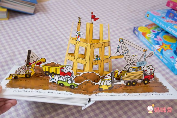 最後一頁還有一個精美的立體畫面,有著各式各樣的工程車,有的蟲蟲開堆土機、有的開挖土機,齊力完成建築!