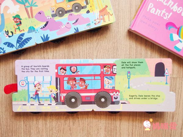 是一本不但可以翻、拉、轉,還有精緻的立體設計喔~(可以看到坐在車內動物的模樣耶!)