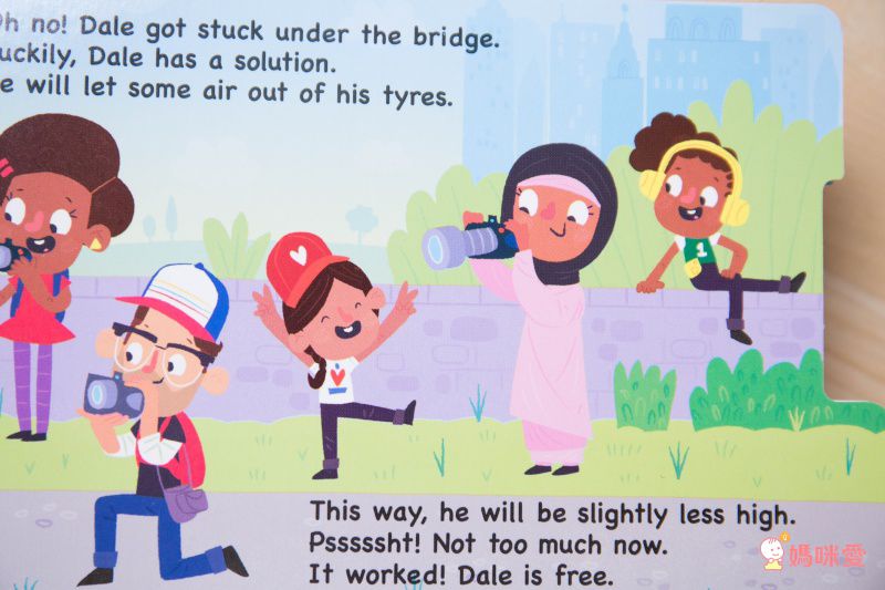 過橋中輪胎居然卡住了!但是將輪胎放氣後,車子又可以順利通過~ 離開橋後,戴爾帶大家看美麗的街景!整本書呈現許多旅客們看到的畫面,繽紛多彩