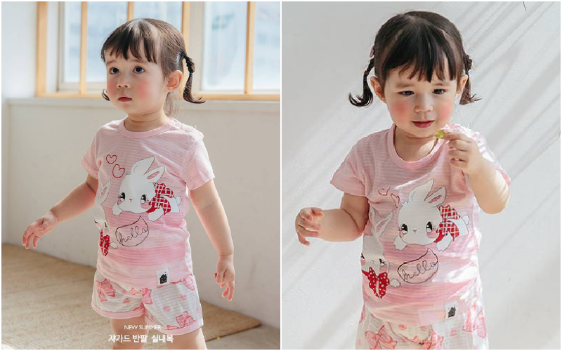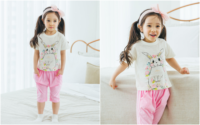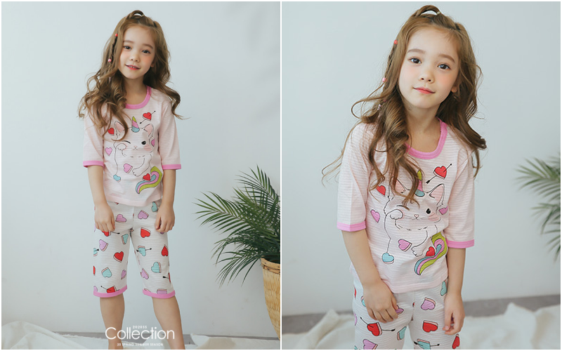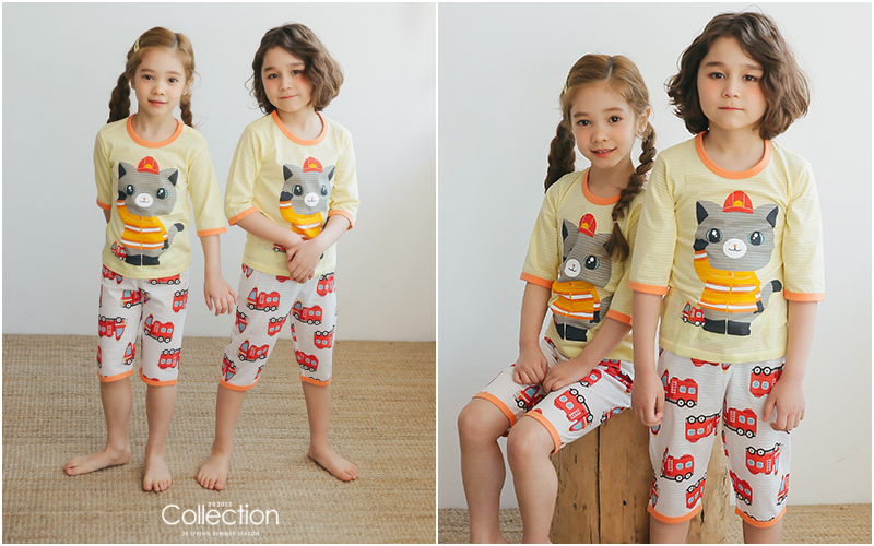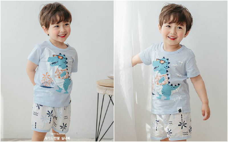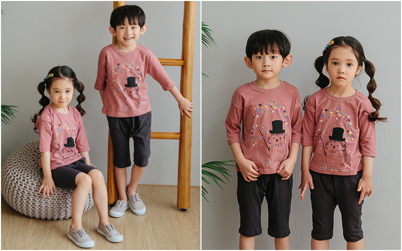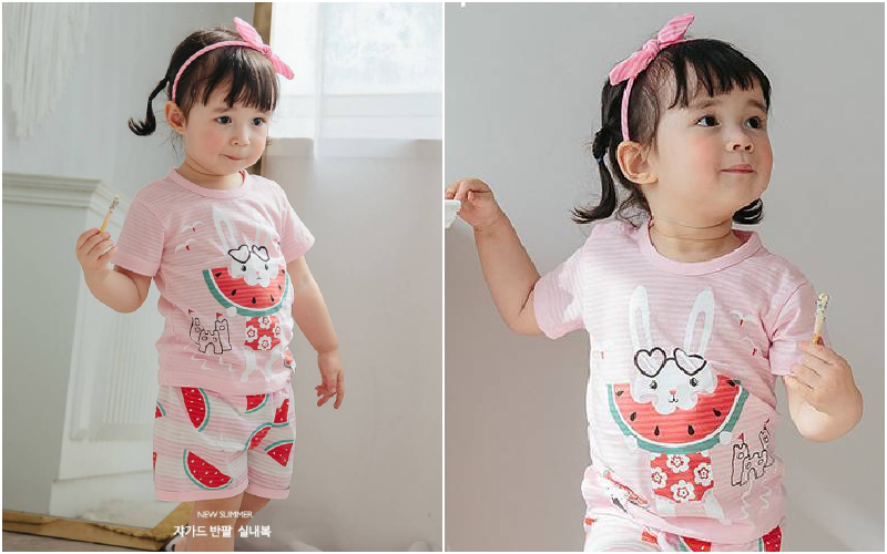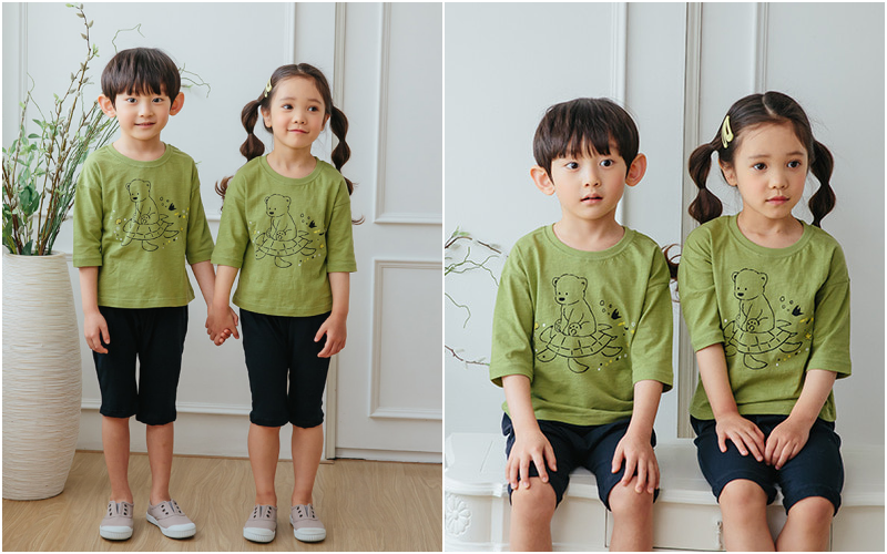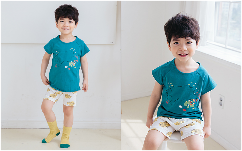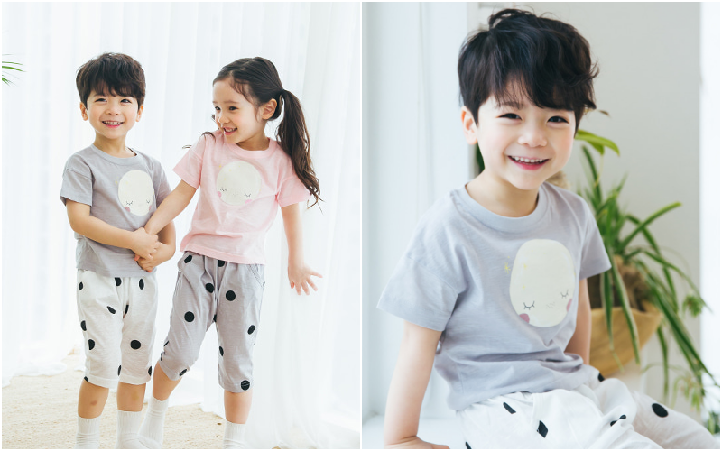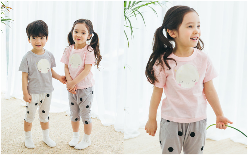 無螢光棉款採用韓國夏季最流行的「緹花織法」,也就是用兩種不同粗細的線來編織,讓花樣維持更長久!布料薄透也不怕容易洗壞~媽咪可以看衣服的特寫照,有一條一條的橫紋線,也是這個織法衣服產生的特色喔~