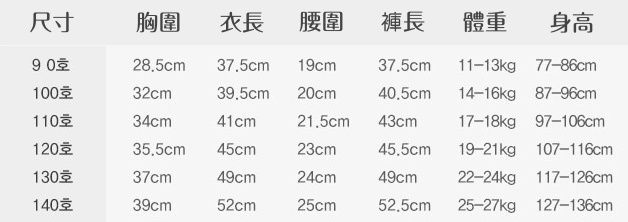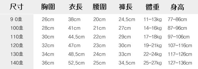 尺寸:90號(77-86cm) 100號(87-96cm) 110號(97-106cm) 120號(107-116cm) 130號(117-126cm) 140號(127-136cm)