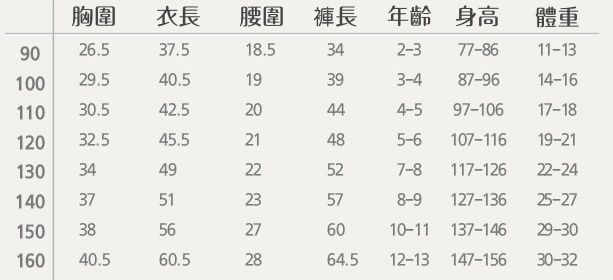 尺寸表給媽咪參考唷~提醒*90-110號,較小尺寸有肩釦,方便小童穿脫,120號以上則無喔!