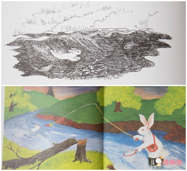 小兔子說:「我要變成溪裡的小鱒魚游得遠遠的」媽媽説:「我就變成捕魚的人去抓你。」就像孩子們長大了想要尋求獨立一樣,書裡的調皮小兔子也是如此,喜歡和媽媽玩「你抓不到」的遊戲,但是兔媽媽也接受挑戰、奉陪到底呢!