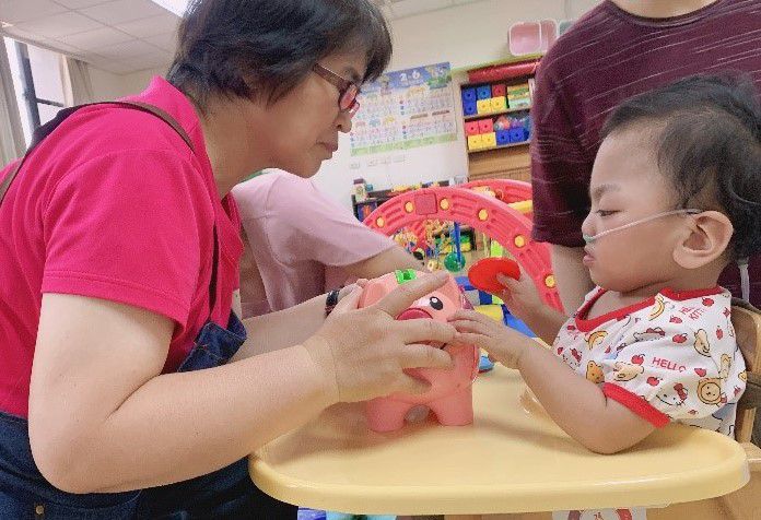 因此,老師透過音樂治療,穩定小麥情緒,再漸漸以互動式遊戲和聲光玩具來吸引她的注意力,隨著課程的適應,更進一步訓練爬行及走路的能力。