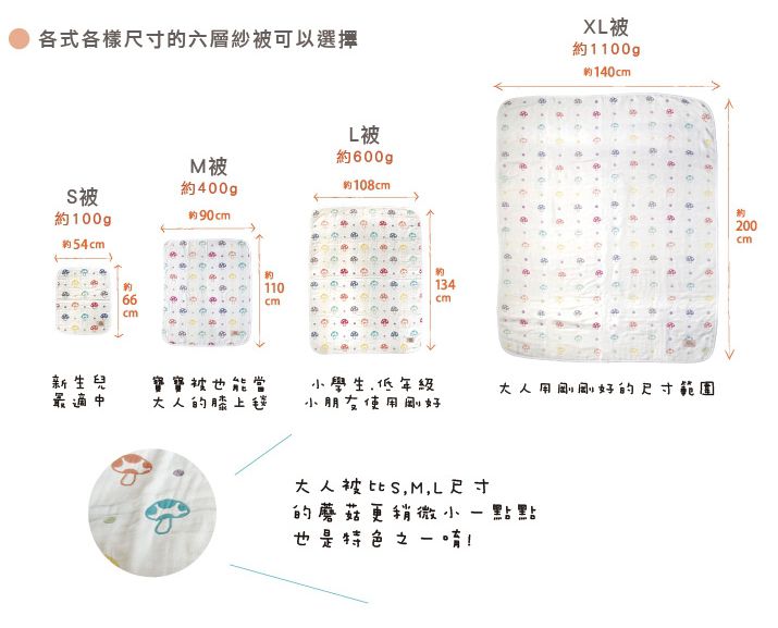 嚴選日本六層紗,紗布經過預縮加工,凹凸部分自然形成空氣隔層,冷的時候保暖不悶熱,熱的時候通風性佳並且可快速吸濕排汗,最適合濕氣重的台灣亞熱帶氣候!而且越洗越柔軟蓬鬆呢(*´∀`)~