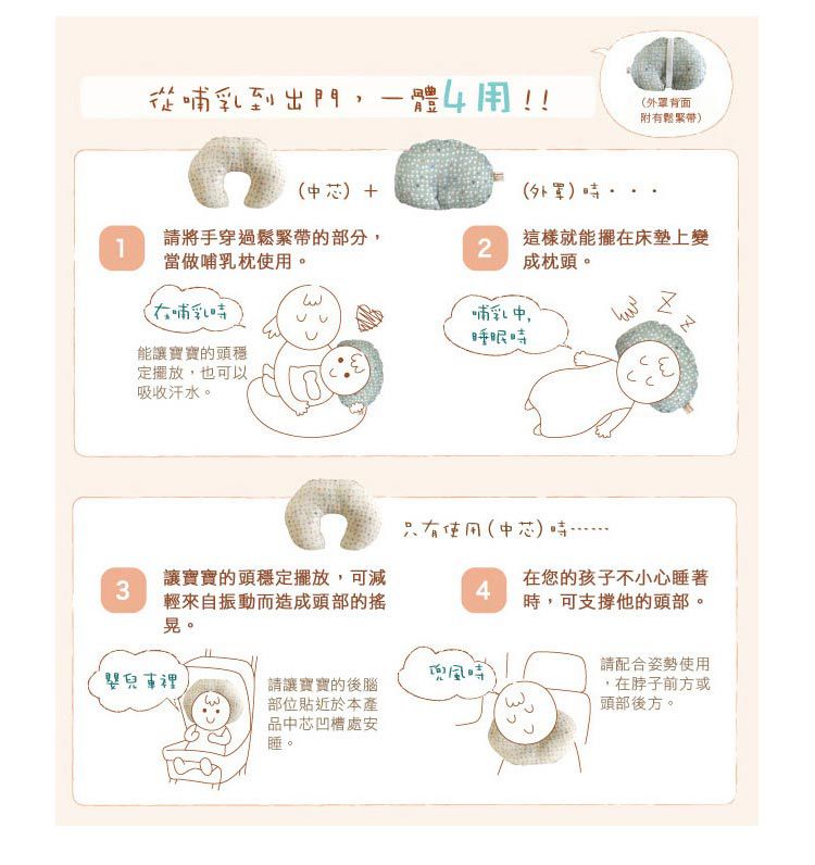 貼心小提醒:使用嬰兒枕時讓嬰兒採仰睡,避免趴睡或側睡,以免發生窒息危險喔