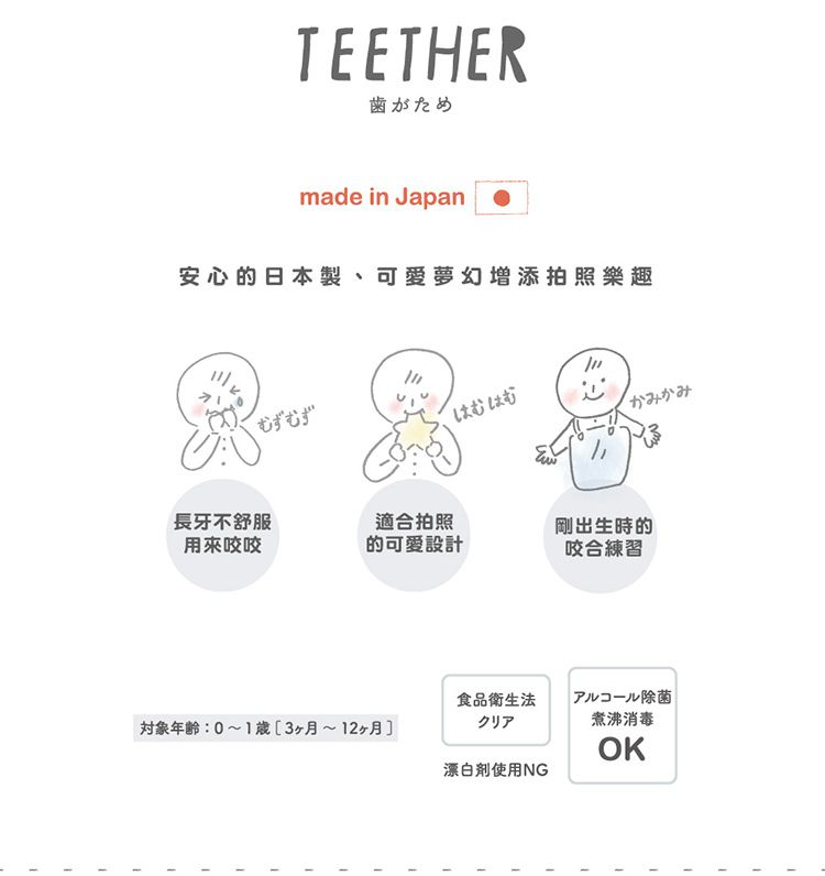 安心的日本製造,不含BPA和鄰苯二甲酸鹽,並且通過食品衛生法,可以放心讓寶貝咬咬咬!酒精消毒是OK的,但不能使用漂白劑喔