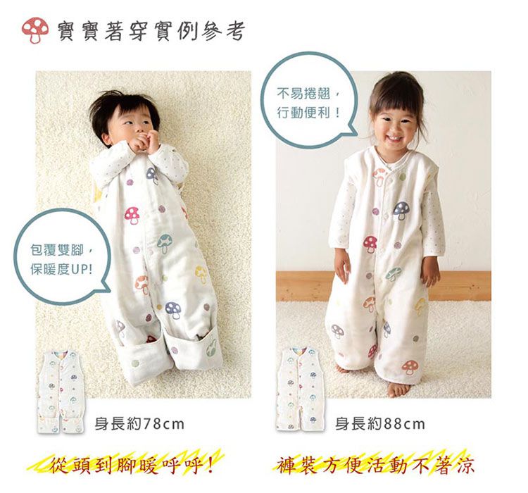 防踢被都有出兩個尺寸,大寶也能穿~幼童款可以一直用到 7 歲,使用期間更長耶!附上嬰童款和幼童款的尺寸比較給媽咪們參考哦~