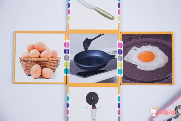 再去尋找雞蛋與煎鍋的《後果》,阿!是煎好的雞蛋!因此放在煎鍋的右邊。在這個過程中,可以讓孩子理解,雞蛋經過煎鍋的烹煮後,形成了日常吃到的煎蛋!