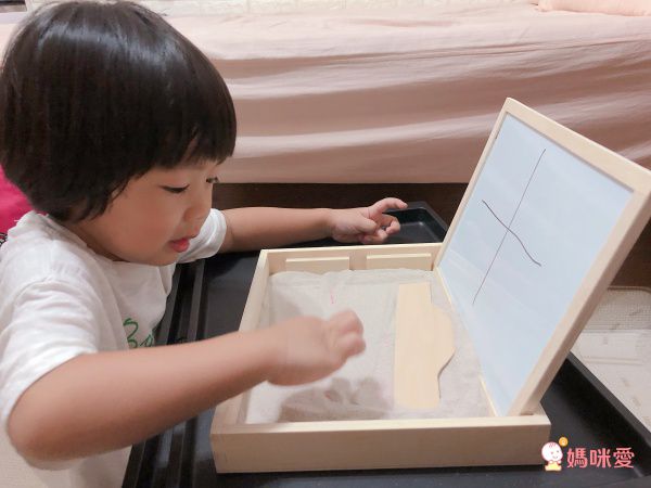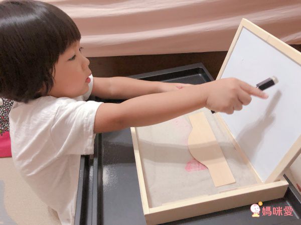 不同於以往的紙筆體驗,麥麥對於在沙盤上畫畫感到很新奇!建議媽咪們沙可以不用倒太多~這樣寶貝在練習的過程中圖形會比較清楚哦!