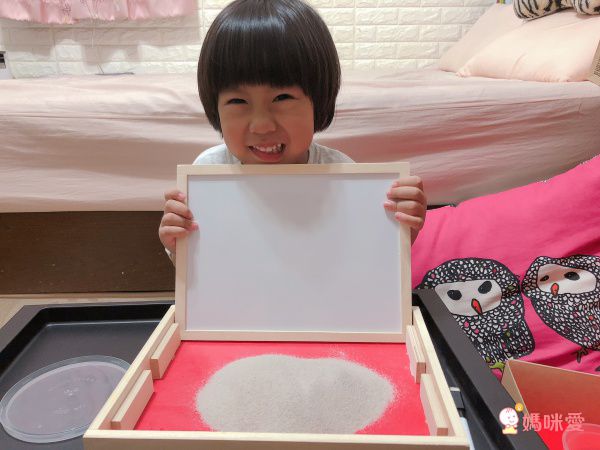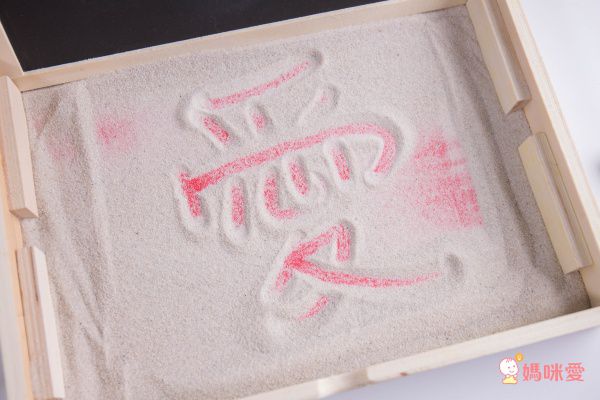 將石英細沙倒入木製的沙盤以後,孩子可以用手指在上面寫字或是塗鴉~