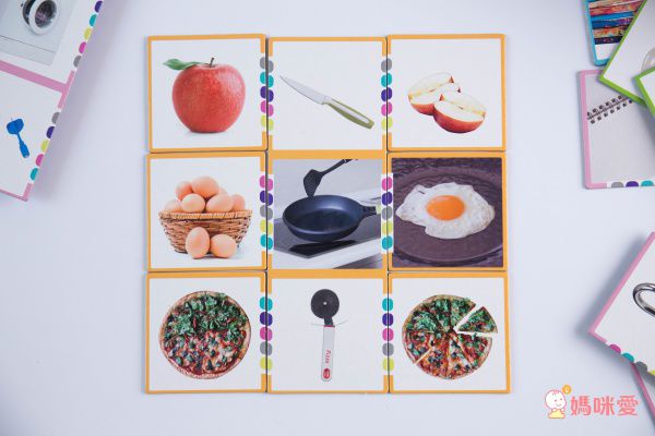 主題卡上的三個圖片都有各自的《前因》和《後果》,像是蘋果經過刀切之後,被切開了,還有一個塊的披薩,利用裁切刀可以被切開,都是很日常生活的舉例,相信年紀小的寶貝也能和情境做連結!