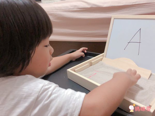 蒙特梭利的教育理念中,孩子的手指就是練習書寫的最好工具,且沙的觸感,也提供孩子不同的觸覺體驗!