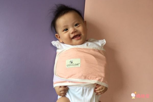 攤開Anna&Eve包巾,分成內層和外層,內層包一圈,外層再包一圈,難怪小嫩嬰無法輕易掙脫囉!一般新生兒(胸圍41-52cm)都適用。