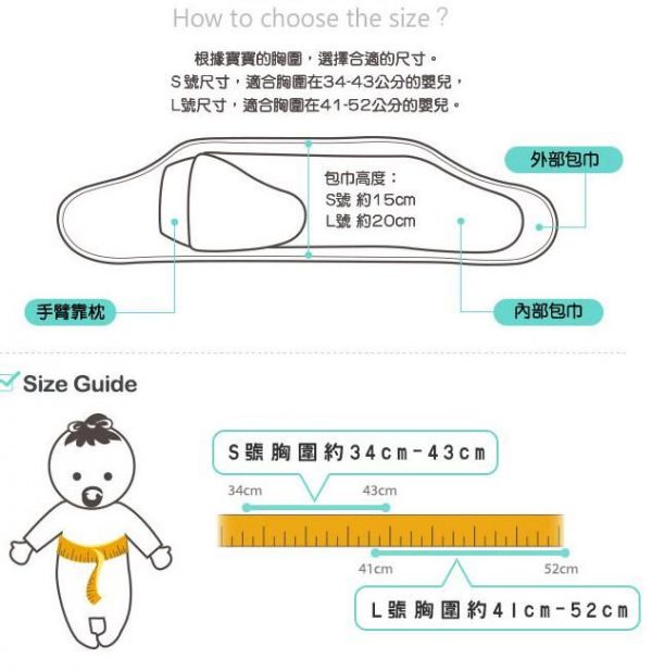 尺寸:L號/胸圍約41cm-52cm(適用於一般新生兒寶寶)、S號/胸圍34cm-43cm(適用於早產兒寶寶)