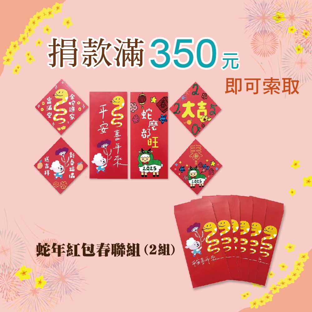 【紅包春聯組】蛇年紅包春聯組,由插畫家-「Cani肯妮」與善牧嘉義中心「璞玉計劃—兒童週末多元學習班」小朋友所繪,祈願新的一年大家「蛇麼都旺」。紅包春聯組每組含6個紅包袋與Cani肯妮手繪春聯及善牧璞玉計劃課輔班的孩子創作的「蛇麼都旺」春聯。