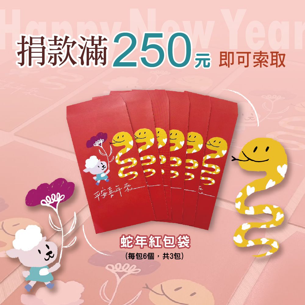 【蛇年紅包袋組】蛇年紅包袋組合共計3包,每包含6個紅包袋,由知名插畫家-「Cani肯妮」為善牧繪製,期望新的一年大家「平安喜年來」