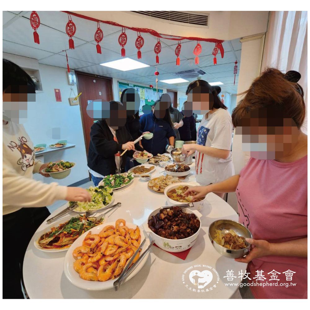 過年不能回家,對台灣婦女而言,有文化上的創傷,尤其除夕,特別有感觸。「所以,年夜飯吃得好,很重要!」不能讓婦女們感覺有落差,因此,善牧受暴婦幼庇護家園每年的除夕圍爐,總是比照傳統家庭拜拜的澎湃菜色,擺滿兩大桌,就是希望婦女感受到有人在照顧她,沒有朋友、沒有娘家資源,沒關係,有善牧,我們在這裡陪你一起過年。