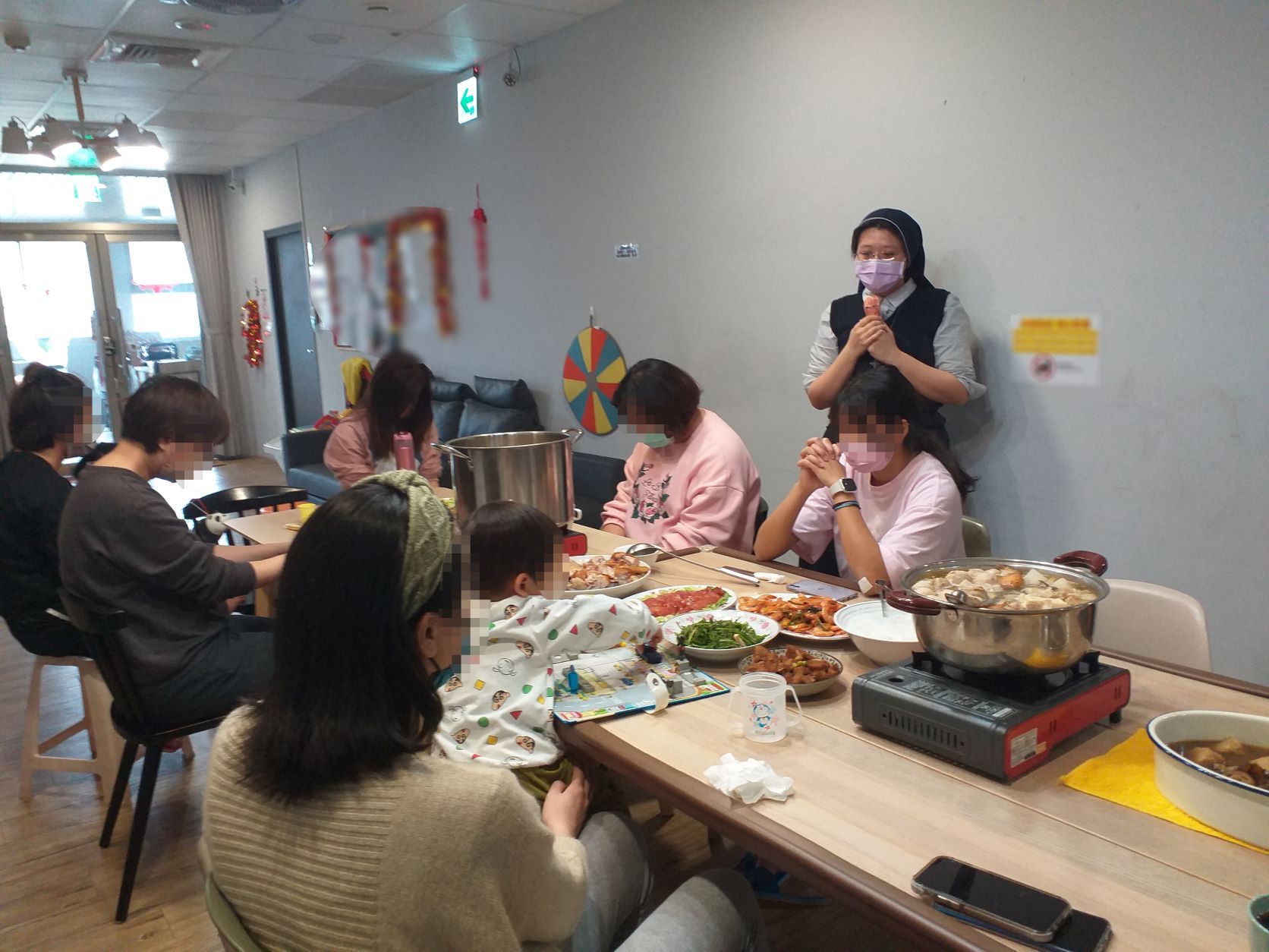 除夕當天,為了晚上的圍爐,生活輔導員一早便開始忙碌。善牧夥伴智琳說:「我們也會邀婦女一起幫忙,像我比較不會做菜就藉機請教,和婦女聊聊她們擅長的事、開心的事,轉移悲傷的情緒。」時常擔任大廚的夥伴淑鎂則覺得雖然累,但累得很值得,「看她們吃得津津有味,一臉滿足,我也跟著開心起來。」甚至曾有婦女跟夥伴霈蓉分享:「身處暴力環境,以前她和孩子從未感受過年節歡樂的氛圍,第一個安心又快樂的年夜飯是在善牧家園度過的,這裡讓她有溫暖的感覺。」