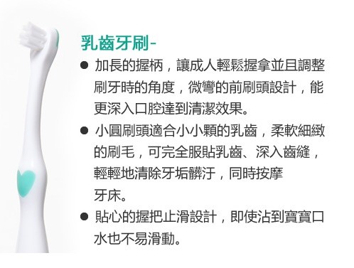 乳齒牙刷是設計來讓媽咪幫寶貝刷牙的:)獨特的角度方便大人操作,而且刷頭小小的,很適合乳齒使用。還有呀!握把上有貼心的止滑,沾滿口水也不怕「古溜」!