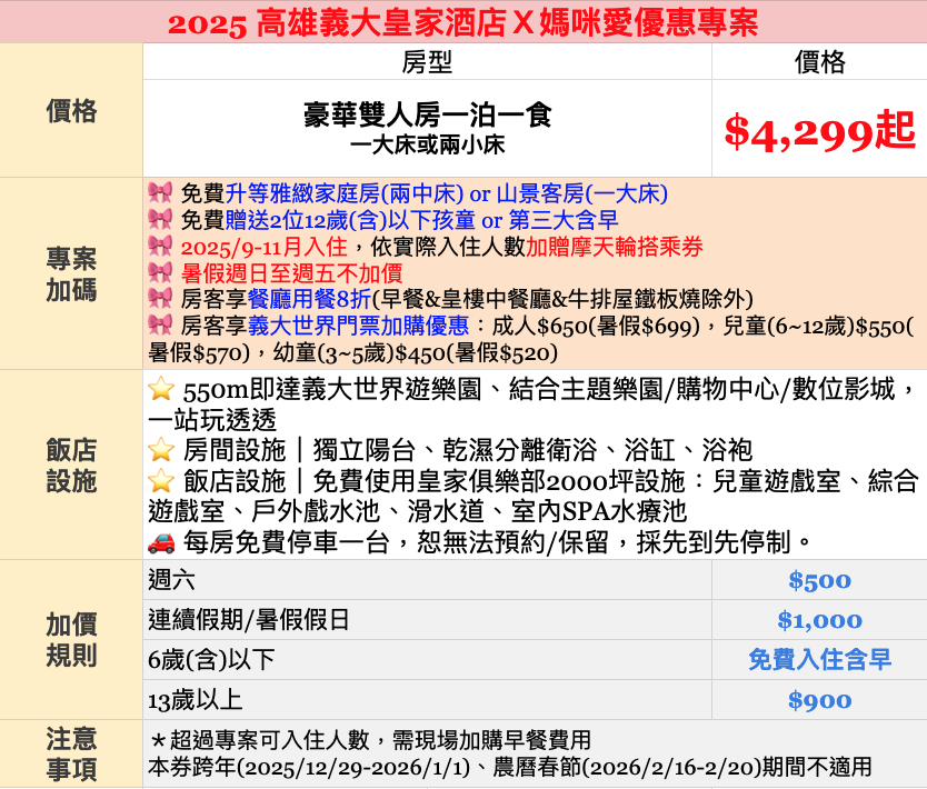 - 此為「媽咪愛專屬優惠」,任何問題都可以詢問我們客服。為保障權益,請勿直接致電飯店,櫃檯服務人員不一定清楚方案喔。