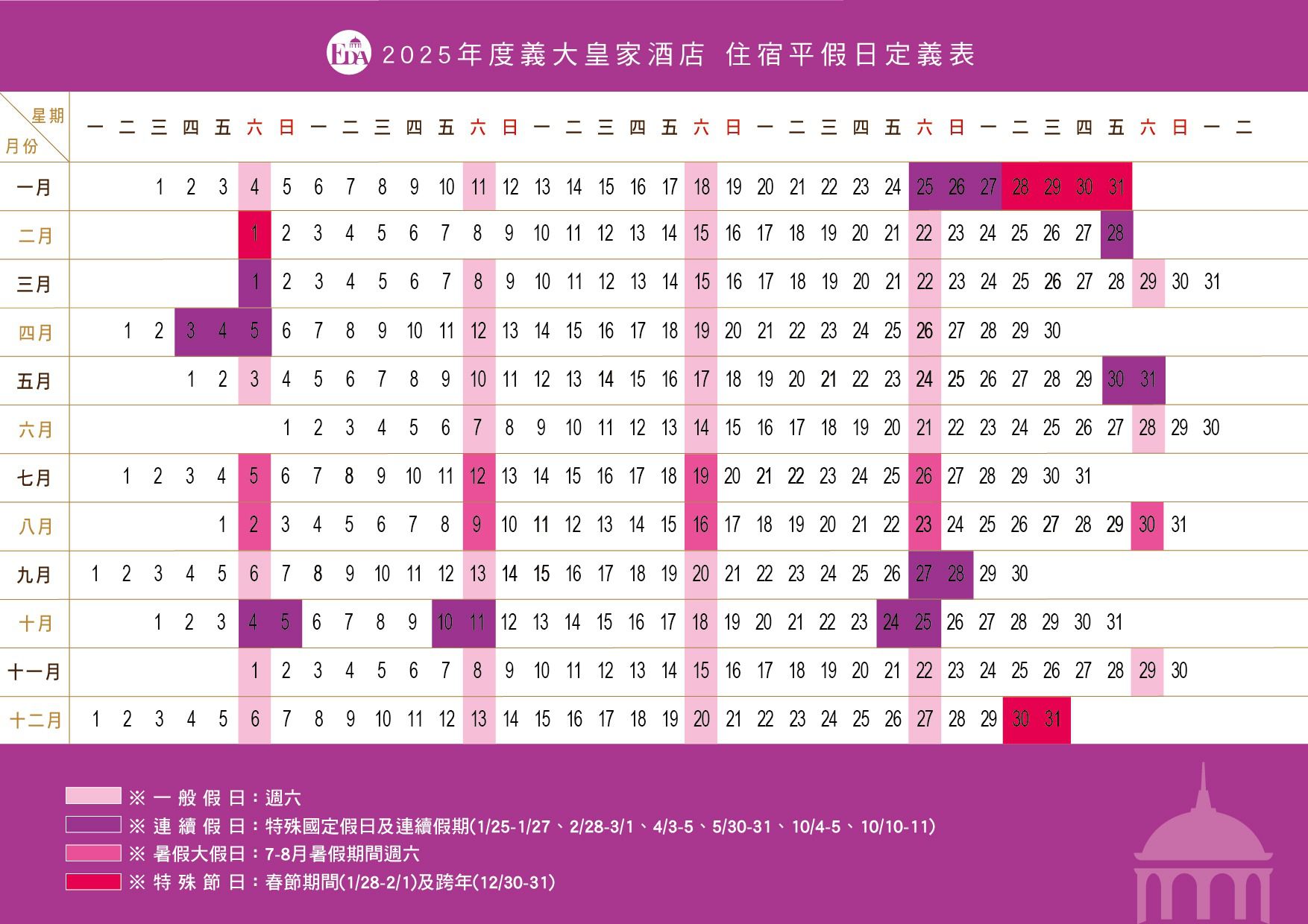 2025飯店平假日行事曆(如有更新依飯店公告為準)