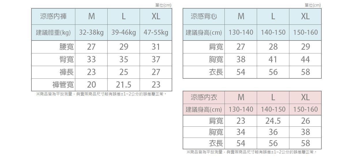 附上尺寸表給媽咪們參考,請參考涼感內衣~