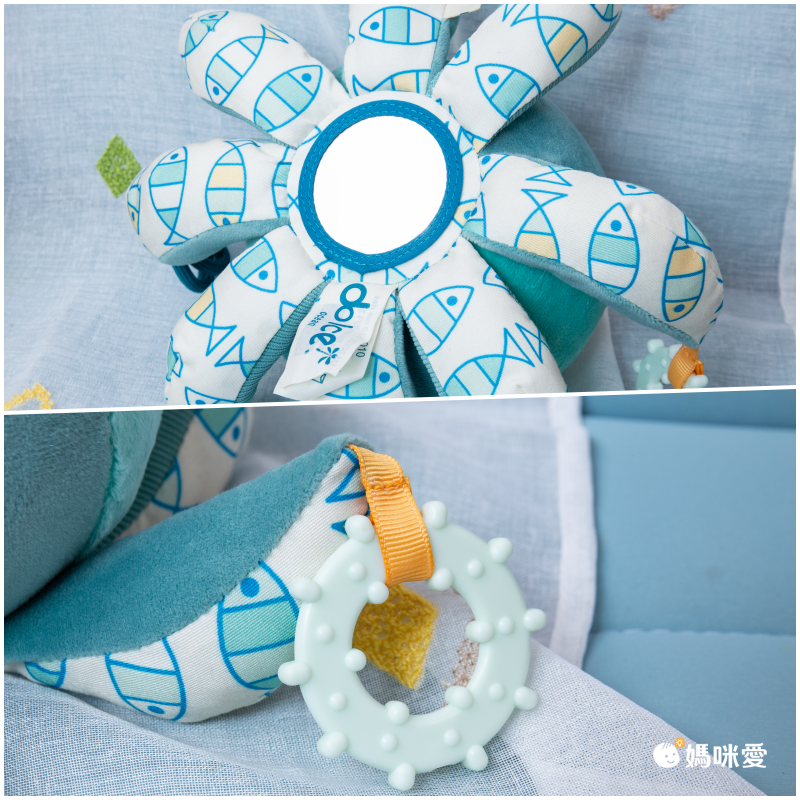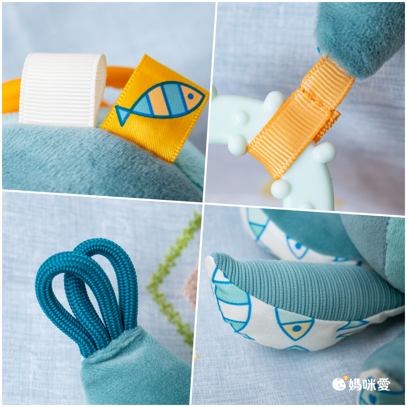 鯨魚身上有很多小機關,除了彩色布標、魚鰭揉捏有聲響、促進視覺的鮮豔圖案、品牌固齒器......等等之外,小零件也不馬虎,擔任海裡小魚的配件,也都有各自的功能喔!